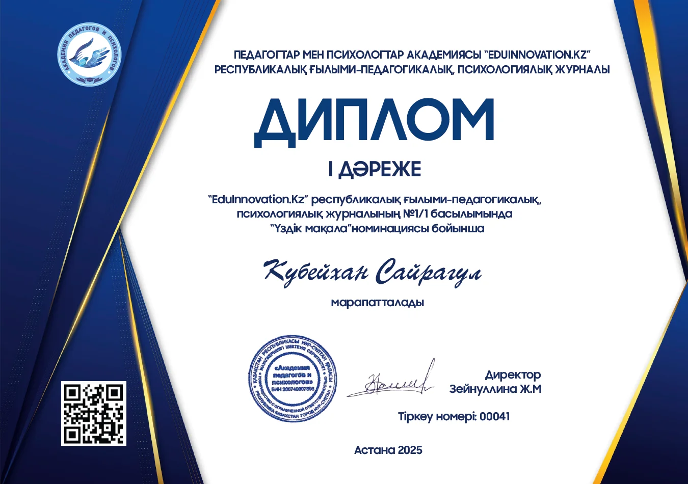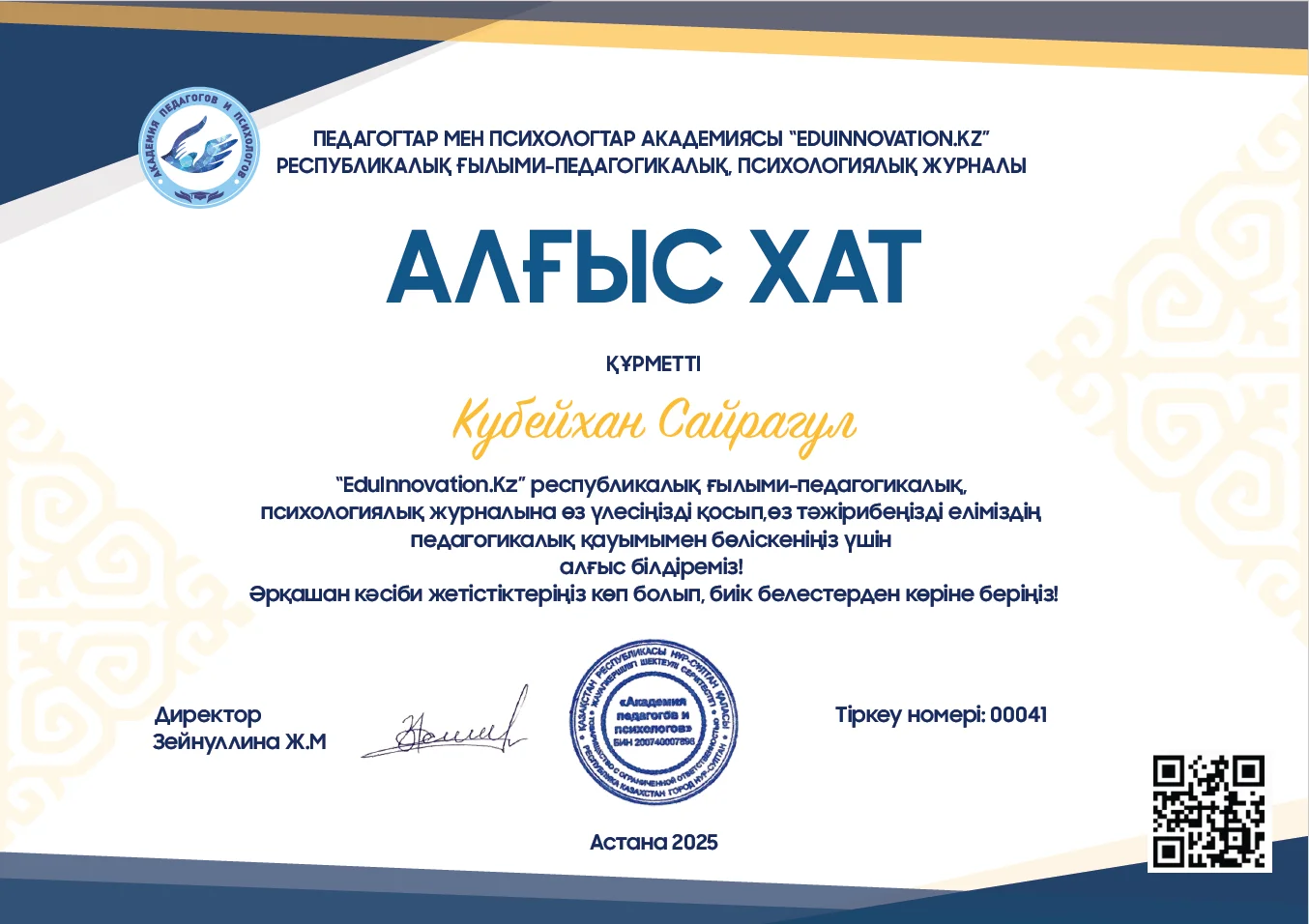 Журналға мақала жарияланғаннан кейін авторға арнайы сертификат, диплом, алғыс хат табысталады. Бұл құжаттар автордың ғылыми-зерттеу жұмысын насихаттауға қосқан үлесін растайтын ресми дәлел ретінде беріледі. Сертификат, диплом және алғыс хат электронды түрде ұсынылады.