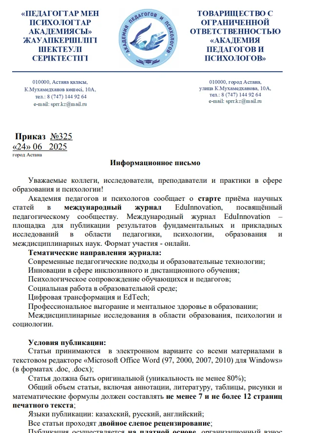 Академия педагогов и психологов сообщает о старте приёма научных статей в Республиканский журнал EduInnovation KZ, посвящённый педагогическому сообществу. Республиканский журнал EduInnovation KZ – площадка для публикации результатов фундаментальных и прикладных исследований в области педагогики, психологии, образования и междисциплинарных наук.